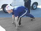 左の写真は一人でストレッチを続けるビスキュイ氏 |