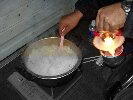 炊飯の担当は大まかに、カレーのルーはビス氏が作って、御飯は615。初めは左の写真のように外で火を使っていたのだが、なかなか温度が上がらないので、車内で煮炊きした。中毒に注意して。車内に入れるとすぐ沸くからおもしろい。車内も暖まっていい感じなり。 |