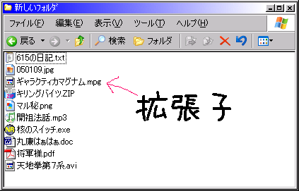 ※拡張子・圧縮・解凍の意味が分かる人は読まなくてもよいページです。 ■拡張子を表示させよう!! 拡張子:かくちょうし ●拡張子とは? パソコンでは様々な形式のデータが扱われてます。拡張子はそのデータ形式を表しています。パソコンはこの拡張子の情報を元にプログラムの形式を認識しています。つまり、拡張子=プログラムの種類です。 「丸廉はぁはぁ.doc」というファイルをダブルクリックしたときにWord