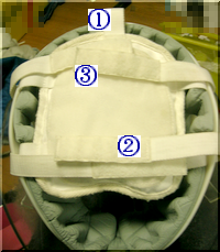 取る時は、下(2)のマジックテープだけを剥がせば外せます。全てのマジックテープを外す必要はありません。上や真ん中のマジックテープは装着する人が変わる時のみ再調節すればいいようです。結構着脱は早く行える面です。