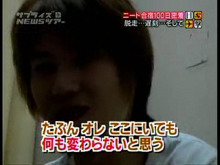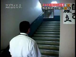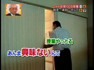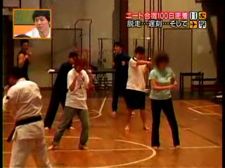 (2005/10/02)2005/10/02にテレビを見ているとCMに入る前に振子突をする集団がチラリ。急いでビデオ(PC)を回してシコシコ録画。社会的に話題となっているニートに関するコーナーでした。およそ23分ほどニートから脱却するための合宿の模様を放送。少林寺拳法を機軸とした合宿なのかもしれん。。。あちこちに少林寺拳法臭さが見えて、(・∀・)イイ!! しかも私の故郷、奈良の話だ!! 番組はこちら、真相報道 バンキシャ!日本テレビ系列です。「ニート合宿100日密着 脱走…遅刻…そして」のコーナー
