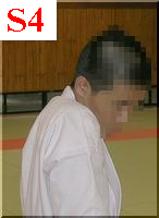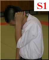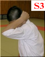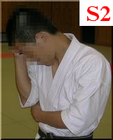 私の場合は顎を引いて(写真S1,S2)、肩を耳に着くくらい寄せて(写真S4)外受側にかなり身体を縮めます。できるだけ中段もカバーしたいからです。S3は脇が空いている状態です。コチラの形はまず私はやりません(中段対策)。私は外受する腕は垂直にしています。