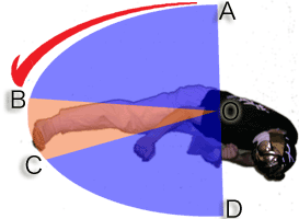 廻蹴のヒットポイントについての話です。廻蹴のヒットポイントは意外と狭いものです。その範囲は正面あたりに位置しており、ヒットポイントの前後(前:OAB,後:OCD)、もしくは廻蹴の円外に運歩をすれば、ずっと安全度が増します(大丈夫とは言ってない)。