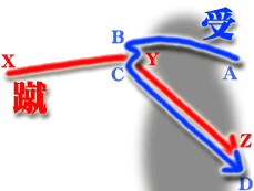 頭に密着させない状態とは体から見て蹴足側に外受を少し張り出しておく状態のことです。 |