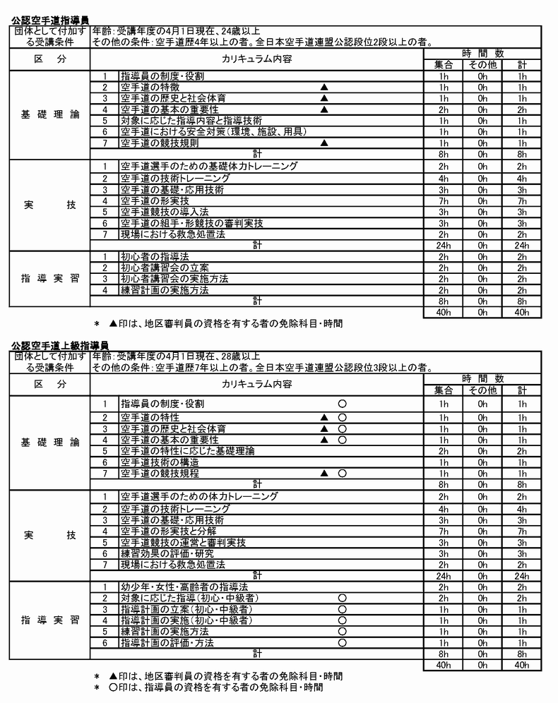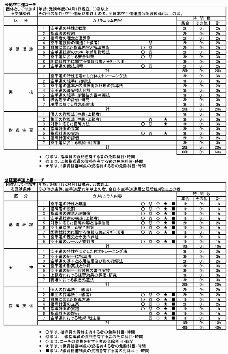 詳しくはページの下のほうにリンクを付けておきましたので、そちらで。では、ここで既にスタートしている「公認空手指導員・コーチ」のカリキュラム(2005/07/30現在)を見てみましょう。