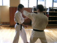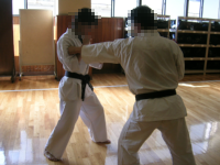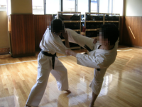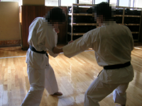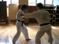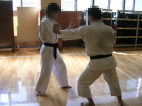 もともと基本の時間に、順突→逆蹴という項目が入れられていました。このような流れで行っていくと、基本から法形、さらに法形に幅を持たせることが可能なので、大変流れが解りやすく「法形を応用する」ということを理解できるかも。またこの拡張は、法形練習の中に攻守が切り替わるという要素を持ち込むためになかなかよいのではないかと思いました。 さらにお気づきの方も多いと思いますが、「順突→逆蹴」とはいわゆる「対角線コンビネーション(左順突やから右廻蹴、右逆突から左順蹴など、上から下への対角線を基点とした攻撃のコンビネーション。オランダ・コンビネーション)」ですね。