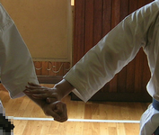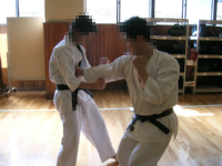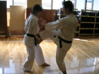今回のネタは、下受蹴をより拡張し攻撃(仕掛け)にも応用しようというわけです。 写真では相手の手を封じて、蹴るということをやってます。自分から仕掛けるときに相手の突が怖い場合・邪魔な場合に、相手の手を抑えつつ間合いを詰めてから蹴る、ということをやりました。