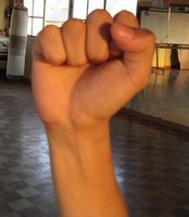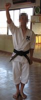 - 右手を高く掲げます。この時、手の平を前します。支部によっては「腕を耳に着ける」と習う場合もある模様。
