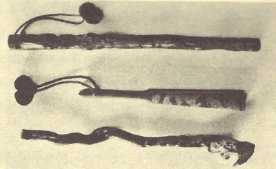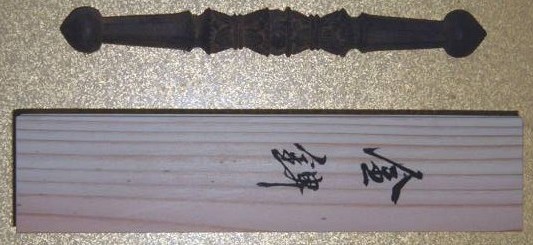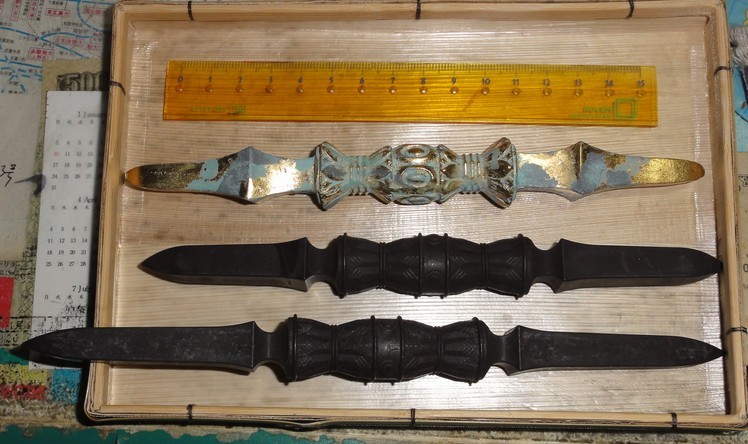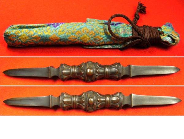 まぁだいたいサイズは25-30cmまでみたいですね。 一番上は、静岡県伊豆の修善寺で売ってる物。 下のは頂き物。硬くはないので演武等には使えません。 上は安かったので何となく買ったもの。400円くらいだた。 下のはも安かった。これくらいの物なら、そこらのアジア小物の店でよく見かける。三鈷は胴紐に通すしか使いが思いつかないので、もうこれで十分。独古はもう少し探す。 上の写真はは自作の独古入れ袋。構造は刀袋と同じ。家にあった端布を使用。ちょうど卍柄だったのでちょうどいいや。下の写真は袋の中身。頂き物。卍の刻印がある。