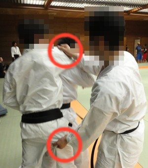 これがあまり良くない例です。相手の背中に対して自分の体が並行です。どうしても背中側から回転してしまうと、自分でコントロールできません。 |