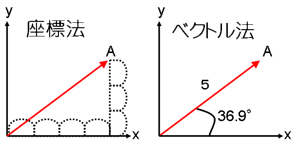 この二つはとても分かりやすいので、まず載せました。まさにそのまんまです。 数学で行きましょう。原点から見た地点Aは座標法かベクトル法で表せますね。座標法ならA(4,3)ですね、x軸に4、y軸に3ということです。ベクトル法はx軸から36.9度の方向に、5進んだところにAがありますね。これは表記が違うけど、Aを表している二つの方法です。 |