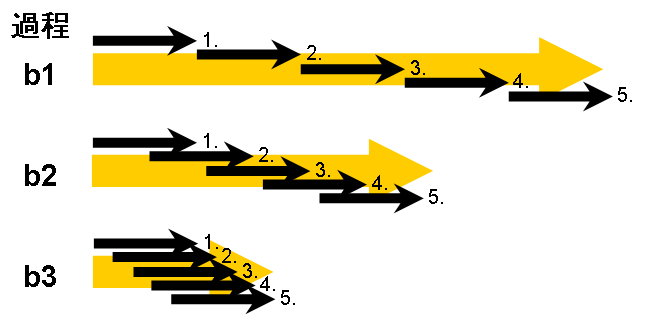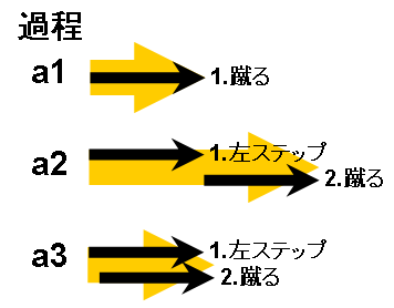 以下は、特に具体的な例ではありませんが五つの動作があったとして、人は自然にそれら五つの動作を一連の動作として集約し始めるということを三つの過程で書いてみました。人は端折ってしまう、ということです。