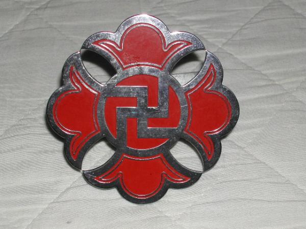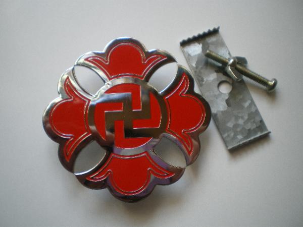 少林寺拳法の旧シンボルマーク、卍のカーバッチです。直径8.9cm。使用しておりましたので、キズや使用感は有ります。中古品と言う事をご理解頂き、ノークレーム・ノーリターンをお約束頂ける方のみ入札をお願いします。送料は定形外郵便200円のご負担をお願いします。