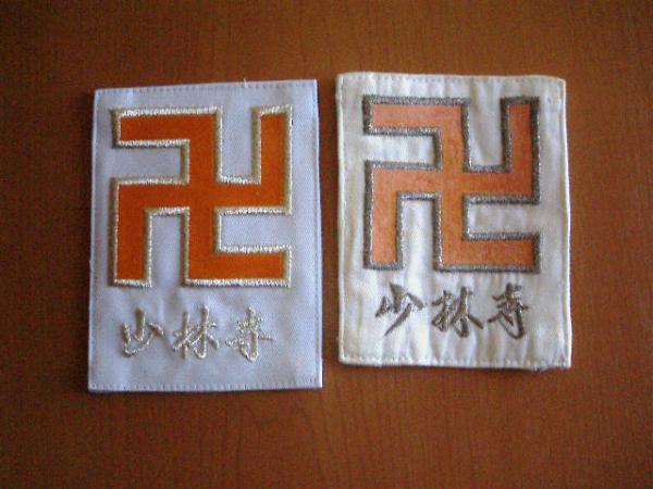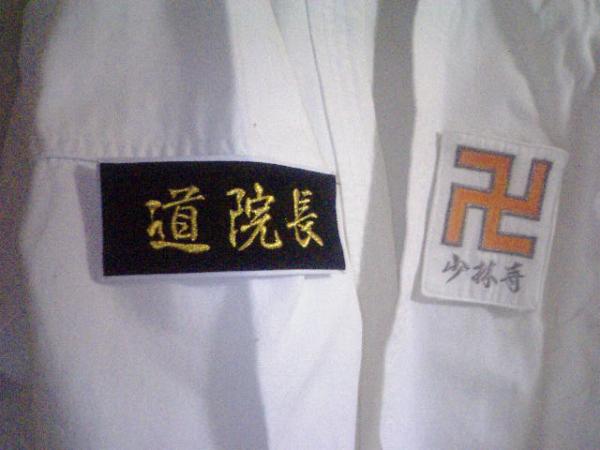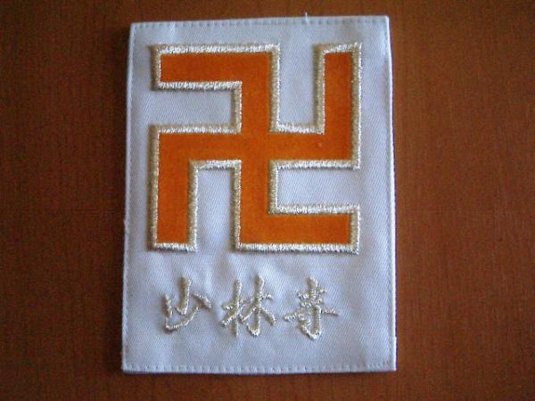 七段以上で門下生から道院長3人以上育て、 なおかつ本部研修を10回以上参加、なおかつ本部役員を務めている高段位者のみが所有する 銀枠に所属「少林寺」の胸章です。