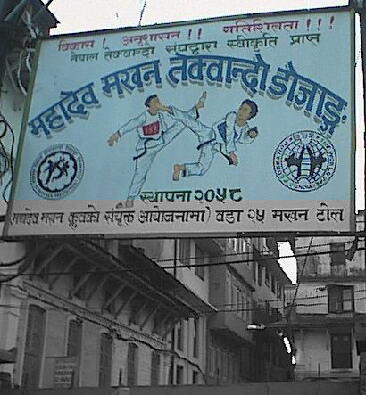 | カトマンの中心市街地にあった看板です.テコンドーです.胴着を着た少年とも二度ほどすれ違いました.