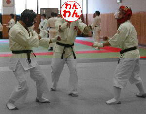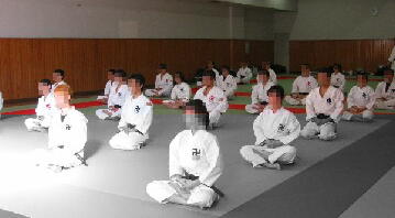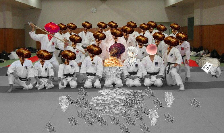 ●全体写真はこんな感じです。真ん中の豪華な茸は「まつたけ」さんです。まつたけ氏は先日初段を得ましたが、帯が間に合わなかったため、茶帯に黒卍というステキなかっこで参坐しました。今回は「初級」を前面にしていたせいでしょうか?級拳士や・女性の方の参坐者が多い気がしました。