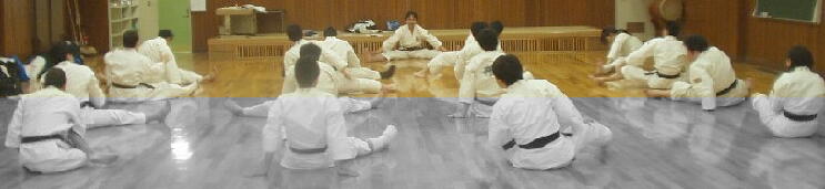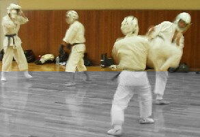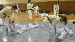 3〜4人のグループで、は5割程度、上段寸止めのつもり、単撃、掴みは有りとし、守者からの攻撃は禁止とします。攻者はどうすれば守者をイテマウことが出来るか、守者はどうすれば攻者から逃れることが出来るかを研究します。 |