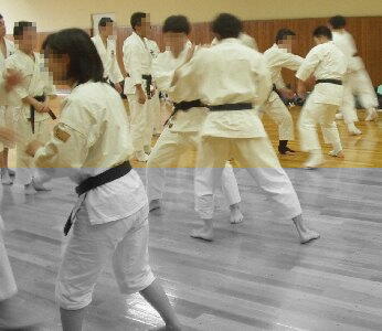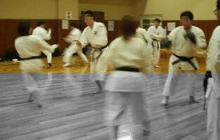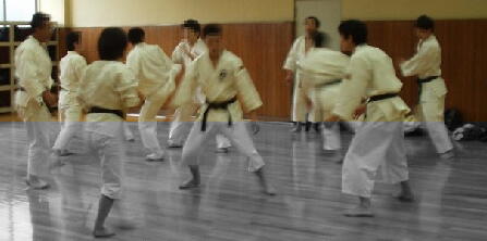 突きの手数を出す練習。構え、突き、蹴りのフォームの確認。攻者・守者の運歩法および攻撃後の体勢。 |