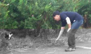 ネコを誘う熊狩氏.しかしあえなく逃げられること二回