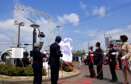 宗由貴総裁らが出席して行われたモニュメントの除幕式=JR多度津駅前 |