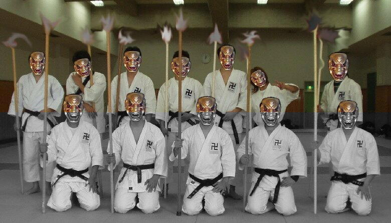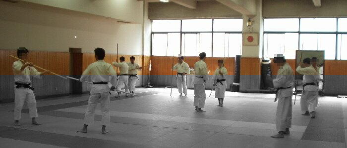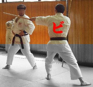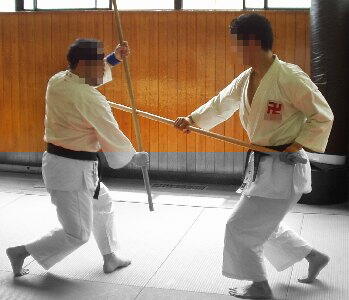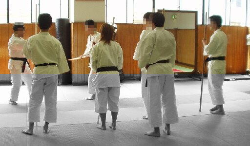 | @Syamiさん(写真奥・左)が錫杖横受の説明をしているところ。 ビシッと軸の通ったSyamiさんの立ち方に注目!対する私・ビスキュイ (写真奥・右,以下「ビ」)は…おいおい軸が曲がってるよ!!