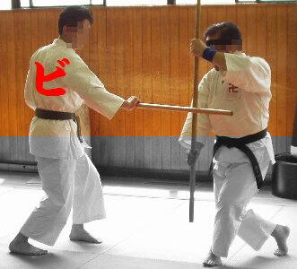 | B横受の説明のアップ 向かって右がSyamiさん,左が私・ビやはりSyamiさんは軸がビシッと立ってますね〜。腰も見事に返って次の右足での蹴りの準備もOK。対するビは軸が曲がり気味…これじゃ威力でないぞ