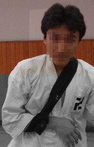 |  | F錫杖受身に失敗して肩を脱臼したすりぃぱあ君の整復後の姿 受身は肘の屈伸を使ってやわらか〜く行かにゃイカンぜよ。それともちっと筋力も付けようね。(び)